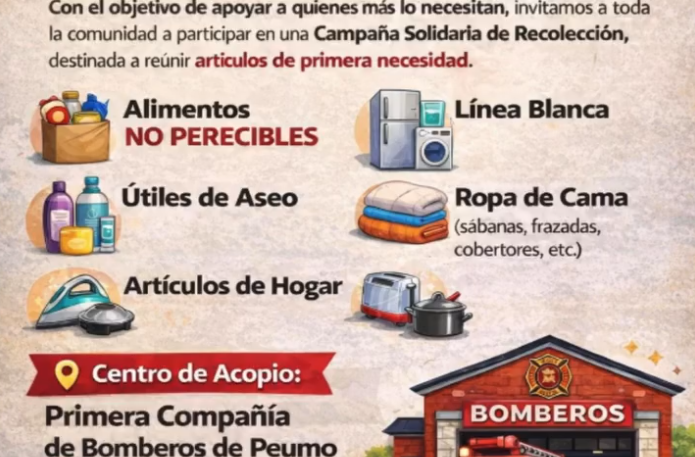 BOMBEROS DE PEUMO INVITA A SER PARTE DE LA CAMPAÑA SOLIDARIA DE RECOLECCIÓN EN APOYO DE LAS VÍCTIMAS DE INCENDIOS EN EL SUR