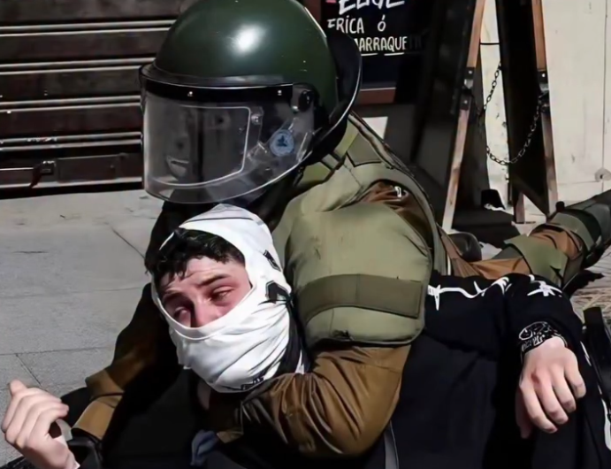 Una fotografía captada en medio de las manifestaciones en Santiago se volvió viral en redes sociales, generando debate por el contexto en que fue tomada. La imagen muestra el momento en que un individuo encapuchado es detenido por Carabineros tras protagonizar desórdenes en la